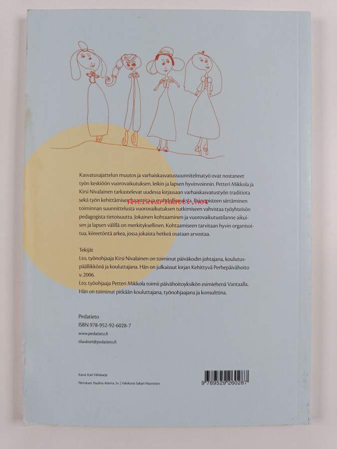 Muu(t) tekijä(t): Kirsi NivalainenMerkinnät: omistajamerkintäAsiasanat: lapsuus, työyhteisöt, vuorovaikutus, kasvatus, oppiminen, pedagogiikka, päivähoito, varhaiskasvatus, päiväkodit, pienryhmät, tiimityö, leikkiminen, toimintakulttuuri, lapset (ikäryhmät)