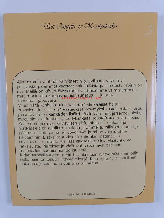 Muu(t) tekijä(t): Ritva Salmi, Pertti Hiltunen ym.Sarja: Uusi ompelu- ja käsityökerho 18Alkuteos: Sewing with special fabricsAsiasanat: ompelu, silkki, sametti, neule