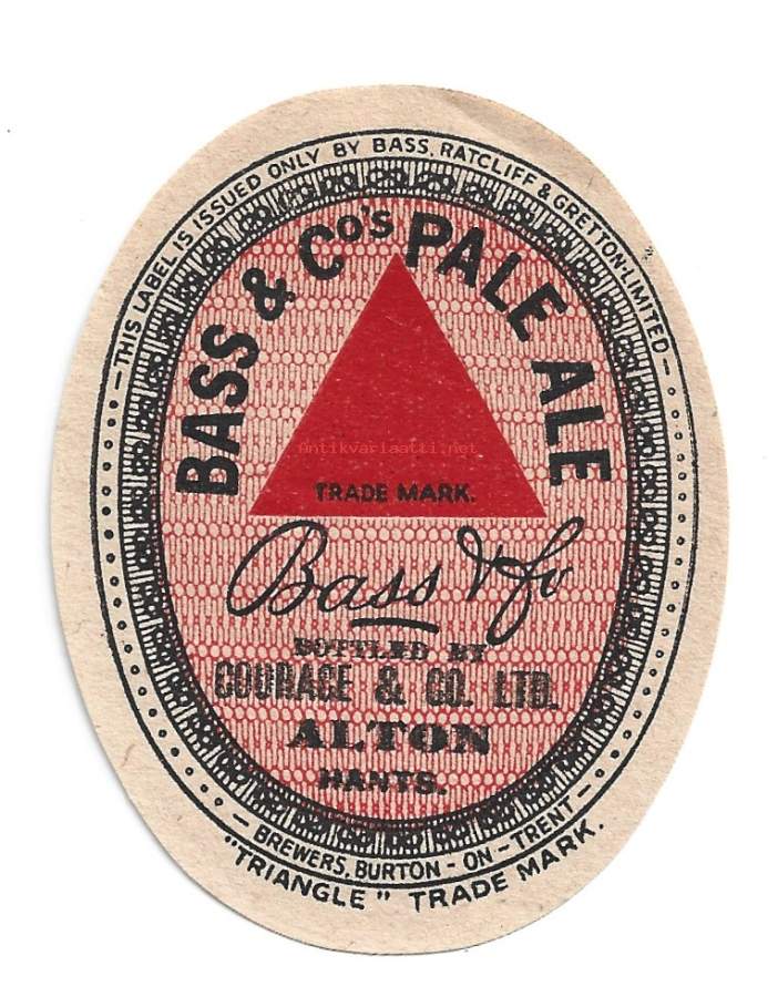 vanha Bass Pale Ale -olutetiketti, joka on historiallisesti merkittävä, sillä sen punainen kolmio oli ensimmäinen Yhdistyneessä kuningaskunnassa rekisteröity tavaramerkki vuonna 1876. Tyyppi: Vintage olutpulloetikettiPanimo: Bass, Ratcliff & Gretton Limited, Burton-on-TrentHistoriallinen merkitys: Maailman ensimmäinen rekisteröity tavaramerkkiValmistaja: Pullotettu Courage & Co. Ltd:n toimesta Altonissa