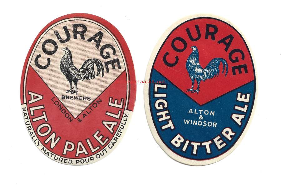 Courage-panimon olutetikettiä.Vasemmanpuoleinen etiketti on Courage Alton Pale Ale -oluelle, jota valmistettiin Altonissa, Englannissa. Oikeanpuoleinen etiketti on Courage Light Ale -oluelle, joka mainitsee myös Altonin ja Windsorin. Molemmissa etiketeissä on panimon tunnusmerkkinä kukko.