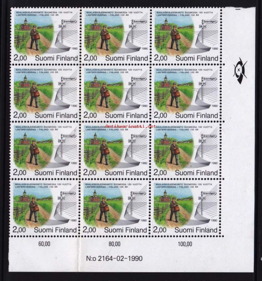 Filatelia Suomi - Maalaiskirjeenkanto Suomessa 100 v., 1990; LAPE 1110** postituore arkinosa 12 kpl.