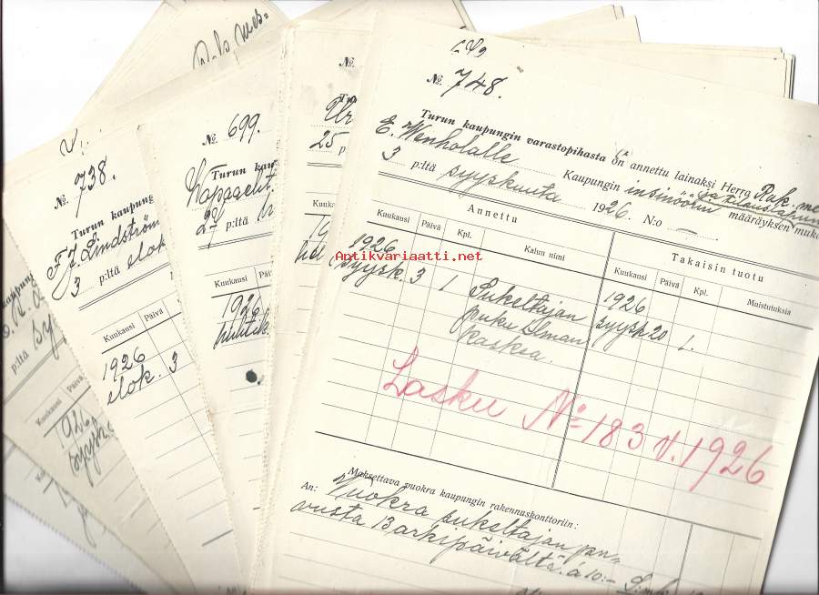 Turun kaupungin varastopihasta on annettu lainaksi .... Turku 1926 - firmalomake n 25 kpl erä