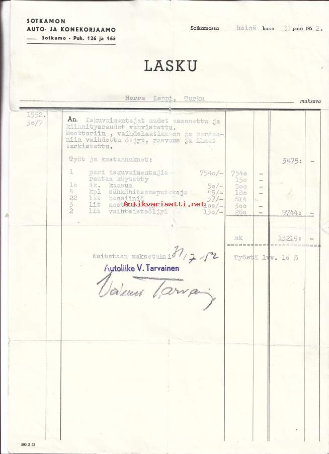 Sotkamon Auto- ja Konekorjaamo Autoliike V Tarvainen Sotkamo 1952 - firmalomake