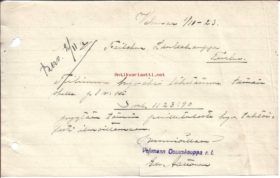 Vehmaan Osuuskauppa 1923 - firmalomake