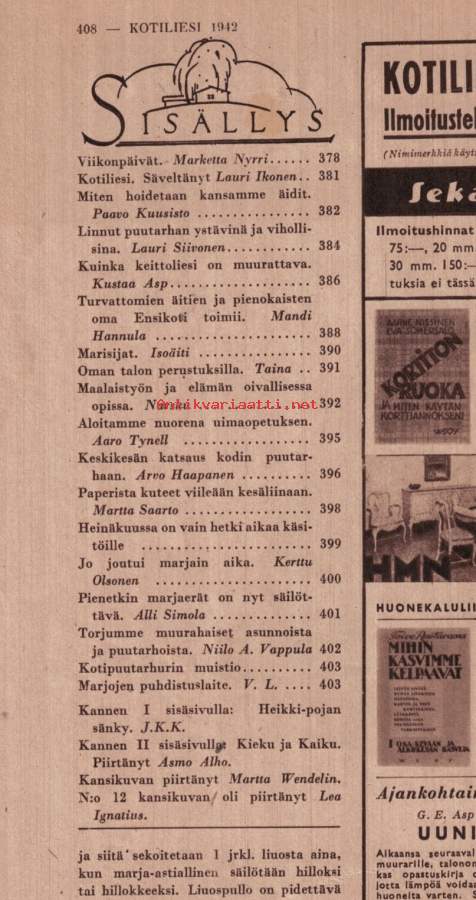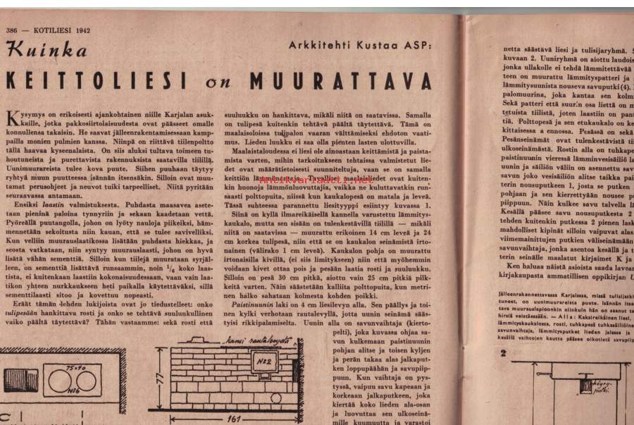 Kotiliesi 1-2 heinäkuu 1941 Perusteellisia ohjeita mm. lieden muuraukseen, talon perustusten tekoon. Linnuista ilona ja suruna, kesän töistä jne.