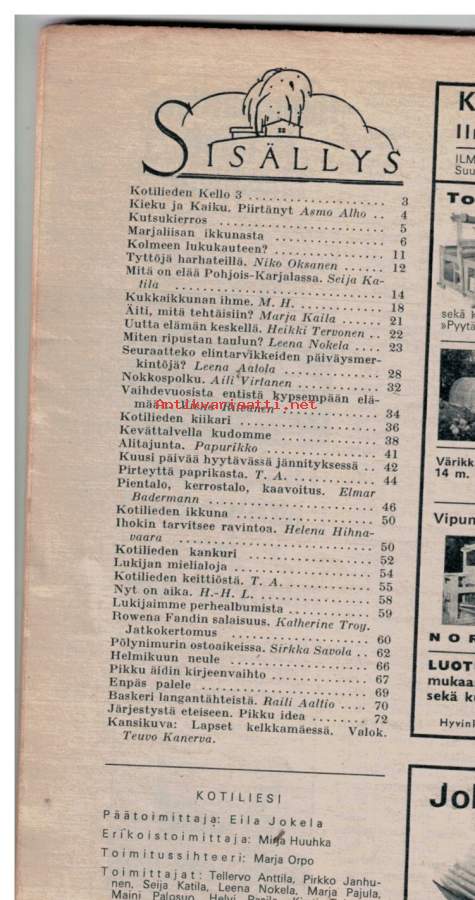 Kotiliesi ,helmikuu1.1969. Neljän sivun juttu kuvineen: Mitä on elää Itä-Karjalassa. Kukka ikkunan ihmeet, Paprikasta pirteyttä,Ohjeita taulujen ripustukseen ym.