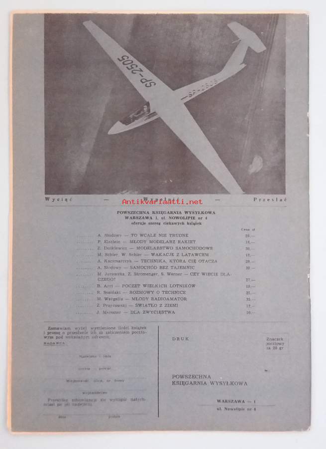 Mały Modelarz oli puolalainen nuorisolle suunnattu mallirakennuslehti ja sitä julkaisi Liga Obrony Kraju (LOK) – Puolan maanpuolustusjärjestö. Lehti sisälsi kartonkimallien rakennuskaavoja kokoamisohjeineen: laivoja, lentokoneita, panssarivaunuja, rakennuksia. Numeron koottavana mallina todennäköisesti on purjelentokone, rekisterillä SP‑2465, on SZD‑24 Foka ‑sarjan purjekone (todennäköisesti Foka 4 ‑versio) . Dimensiot 30 ¤ 21 cm. Harvinainen ja hyväkuntoisen erittäin harvinainen Mały Modelarz was a Polish model‑building magazine aimed at young hobbyists, published by Liga Obrony Kraju (LOK) – the Polish national defense organization. Each issue contained paper model templates with assembly instructions, covering subjects such as ships, aircraft, armored vehicles, and buildings.The model featured in this issue is most likely the SZD‑24 Foka series glider (probably the Foka 4 version), identified by the registration SP‑2465 shown on the cover. The magazine includes printed parts and instructions for constructing a detailed paper model of this aircraft. Dimensions: approximately 30 × 21 cm.This issue is rare, and copies in good or excellent condition are extremely rare, Condition grade K3+ or K4. The covers show slight fading. No tears, no markings. The template sheets are flawless and uncut