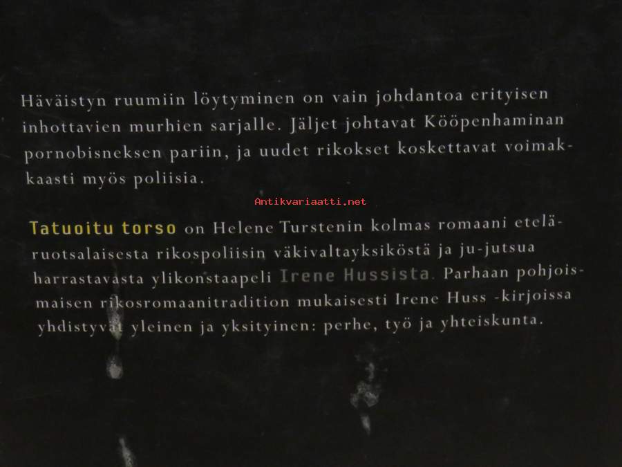 Tatuoitu torso / Helene Tursten.P.2005. Jos haluaa arvaamatonta, hiukset pystyyn nostavaa jännitystä palasteltavien uhrien mukana,tässä sitä on.