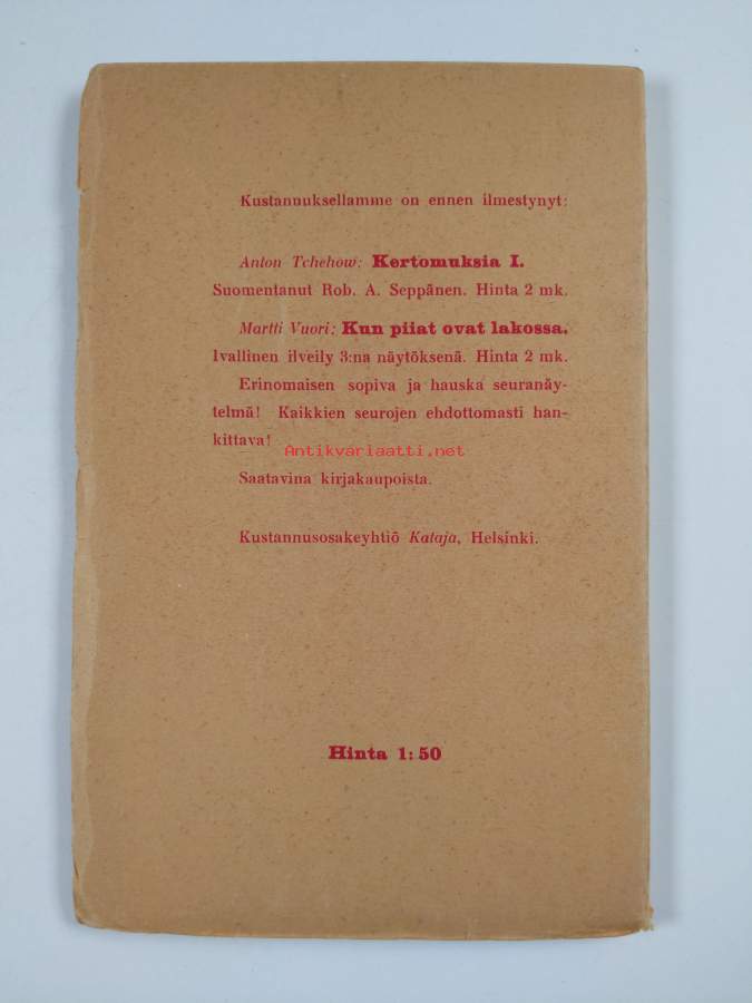 Hyvä. Tarkempi kuntoluokka: K3- ; Hieman repeämää reunoilla ja kulmissa, selkämyksessä aavistus vinoutta, sivut vielä osittain leikkaamatta auki eli osittain lukematon kirja