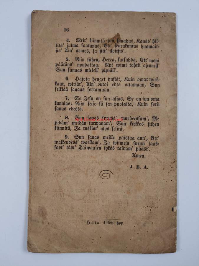 Tyydyttävä. Tarkempi kuntoluokka: K2+ ; Selkämyksessä aavistus vinoutta. teksti fraktuuraa ; kansissa ja parilla sivulla hieman läikkää/tahraa