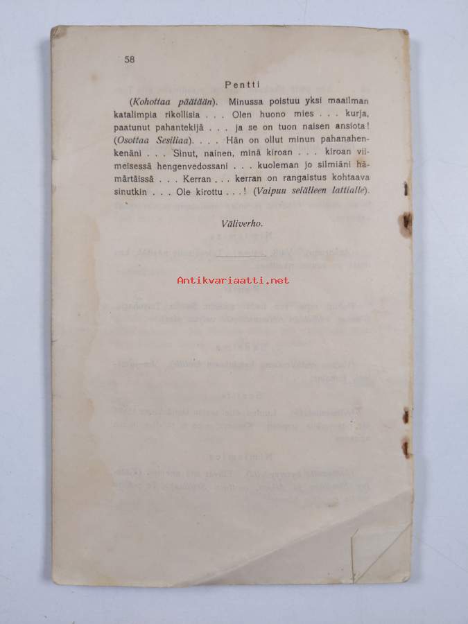 Huonokuntoinen (lukukelpoinen). Kannet puuttuvat ; nimiösivulla ja muutamalla ensimmäisellä sivulla jonkin verran läikkää