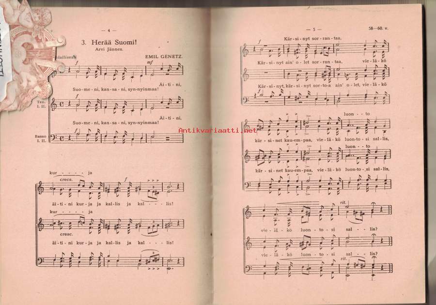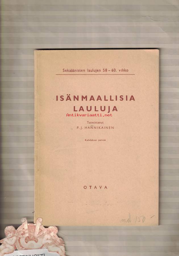 1 MaammeVårt landPacius, Fredrik, säveltäjä ; Runeberg, Johan Ludvig, sanoittaja2 Kuule kuinka soitto kaikuuSuomis sångPacius, Fredrik, säveltäjä ; Qvanten, Emil von, sanoittaja3 Herää Suomi!Herää Suomi!Genetz, Emil, säveltäjä ; Jännes, Arvi, sanoittaja4 Yks' voima sydämehenIsänmaalle, JS98ASibelius, Jean, säveltäjä ; Cajander, Paavo, sanoittaja5 Isänmaan kasvotIsänmaan kasvotKilpinen, Yrjö, säveltäjä ; Koskenniemi, V. A., sanoittaja6 Terve, Suomeni maaTerve, Suomeni maaGenetz, Emil, säveltäjä ; Hannikainen, P. J., sanoittaja7 Ajan aallotAjan aallotJärnefelt, Armas, säveltäjä ; Hannikainen, P. J., sanoittaja ; Erkko, J. H., sanoittaja8 Oi kallis SuomenmaaLaulut, op41. Nro 3, Oi kallis SuomenmaaKlemetti, Heikki, säveltäjä ; Klemetti, Heikki, sanoittaja9 Hymni isänmaalleHymni isänmaalleHannikainen, P. J., säveltäjä ; Ahlqvist, August, sanoittaja10 Hymni SuomelleFosterländsk hymnCrusell, Bernhard Henrik, säveltäjä ; Rahkonen, Aleksanteri, sanoittaja11 Hymni Suomelle : loppukuoro oopp. "Kaarle kuninkaan metsästys"Kung Karls jakt. Hymn till FinlandPacius, Fredrik, säveltäjä12 Suomen valtaSuomen valtaGenetz, Emil, säveltäjä ; Ahlqvist, August, sanoittaja13 Virsi kotimaan puolestaOi kuningasten kuningasKrank, F. P., säveltäjä ; Suonio, sanoittaja14 Kansalaislaulu : suom. kansansävelmäOlet maamme armahin SuomenmaaErkko, J. H., sanoittaja15 Honkain keskelläSuomen salossaEnnola, Juhana, säveltäjä ; Yrjö-Koskinen, Yrjö Sakari, sanoittaja16 Suomen lapsiPrincessan av Cypern. O Hellas barnPacius, Fredrik, säveltäjä17 Oi kuulkaatte, kuinka se sykkäileePäivän laulu, op61, nro 4Melartin, Erkki, säveltäjä ; Leino, Eino, sanoittaja ; Railio, Juho, sanoittaja18 Porilaisten marssiBjörneborgarnes marschRuneberg, Johan Ludvig, sanoittaja ; Klemetti, Heikki, sanoittaja19 Hämäläisen lauluHämäläisen lauluErkko, J. H., sanoittaja20 Kesäpäivä kangasallaJag gungar i högsta grenenLinsén, Gabriel, säveltäjä ; Topelius, Zacharias, sanoittaja ; Hannikainen, P. J., sanoittaja21 Savolaisen lauluSavolaisen lauluCollan, Karl, säveltäjä ; Oksanen, August, sanoittaja22 Karjalaisten lauluKarjalaisten lauluHannikainen, P. J., säveltäjä ; Hannikainen, P. J., sanoittaja23 KarjalaKarjalaGenetz, Emil, säveltäjä ; Jännes, Arvi, sanoittaja24 Vaasan marssiVasa marschCollan, Karl, säveltäjä ; Topelius, Zacharias, sanoittaja ; Noponen, Alpo, kääntäjä25 Milloin Pohjolan nähdä saanMilloin Pohjolan nähdä saanKlemetti, Heikki, säveltäjä ; Yrjö-Koskinen, Yrjö Sakari, sanoittaja26 Kymmenen virran maaKymmenen virran maa, op57Merikanto, Oskar, säveltäjä ; Koskimies, Aukusti Valdemar, sanoittaja27 Uusmaalaisten lauluUusmaalaisten laulu, JS214ASibelius, Jean, säveltäjä ; Terhi, Kaarlo, sanoittaja28 Varsinaissuomalaisten lauluVarsinaissuomalaisten lauluMikkola, Viljo, säveltäjä ; Kulo, Väinö, sanoittaja29 Satakunnan lauluSatakunnan lauluTörnudd, Aksel, säveltäjä ; Voipio, Aino, sanoittaja30 Kotiseutu kullankallisKotiseudulleHannikainen, P. J., säveltäjä ; Hannikainen, P. J., sanoittaja- Pieni Helposti kuori15 x 21 cm.