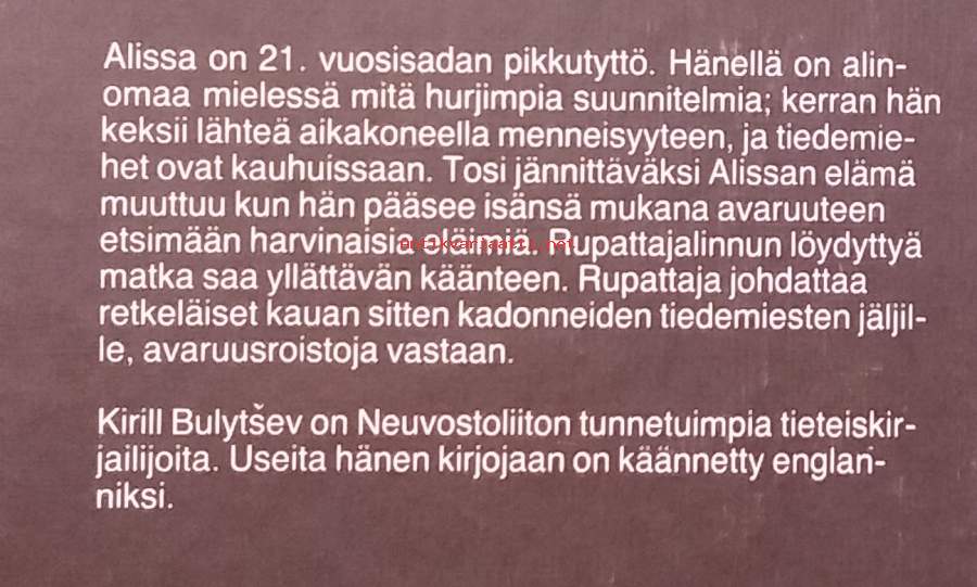 Alissa on avaruusmatkailijan tytär, joka päätyy mukaan seikkailuun planeetalta toiselle.Hän kohtaa outoja olentoja, ratkaisee pulmia ja joutuu vaarallisiin tilanteisiin..... Dimensiot 20 ¤ 13 cm.
