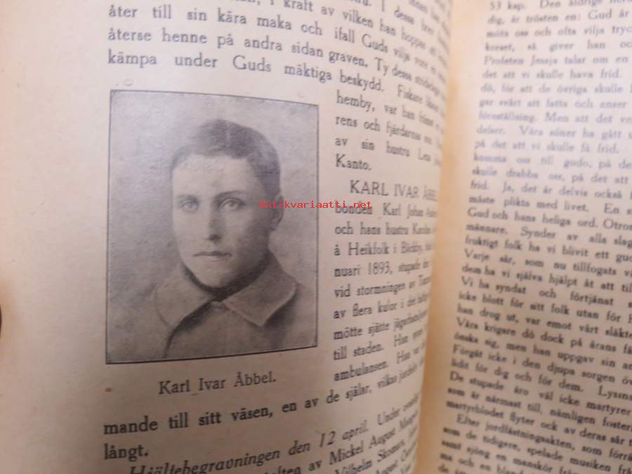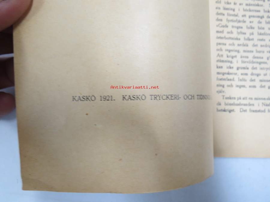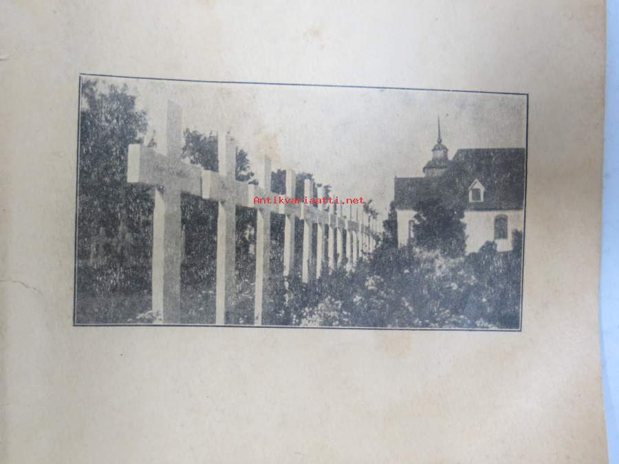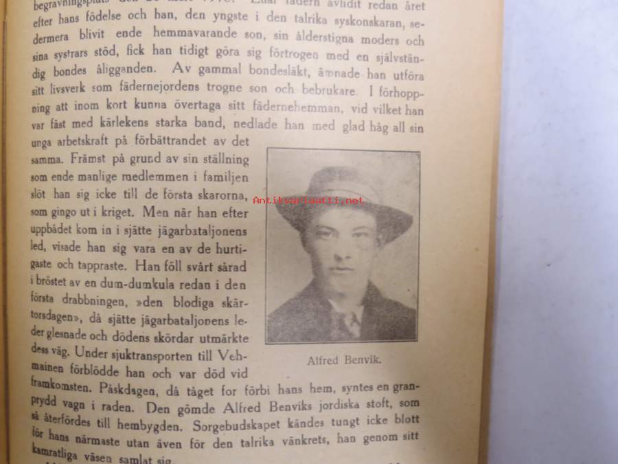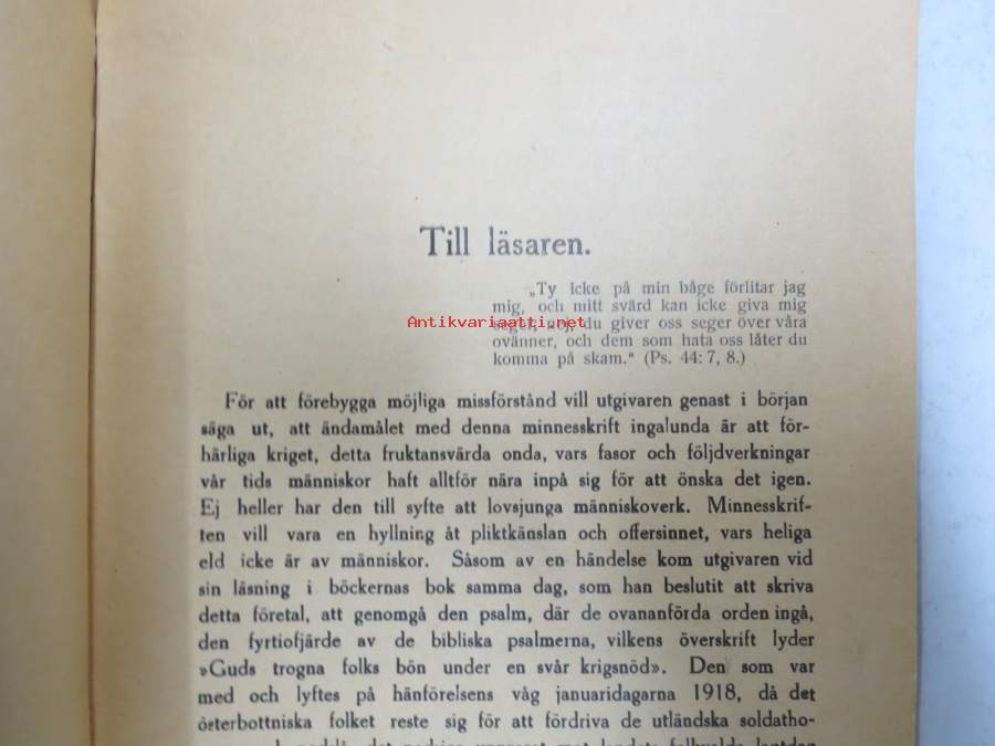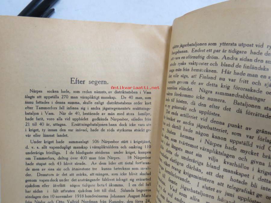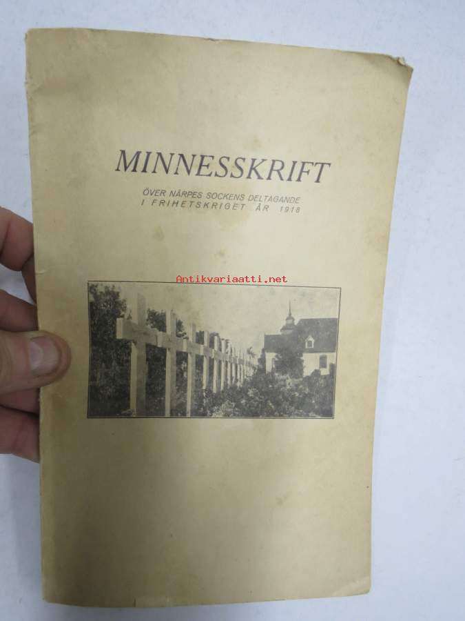 14 x 23 cm, hyvin harvinainen julkaisu. Kuvat ja elämäkerrat (matrikkelitiedot) närpiöläisistä Vapaussodassa kaatuneista sekä mahdollisimman tarkka selostus kaatumisesta taistelutilanteissa; Johan Alfred Nordman, Karl Birger Roth, Johan Isidor Berg, Karl Alfred Benvik, Anders Johan Bonde, Mickel August Mangsén, Adrian Granskog-Mattfolk, Johan Oskar Perus, Johan Axel Södergrann, Oskar Herman Virta, Johan August Österback, Karl Vilhelm Skomars, Karl Ivar Åbbel, Josef Vilhelm Joppas, Karl-Ivar Melin-Uljens, August Arvid Vester, Karl Johan Berg, Sigurd Valdemar Snickars. Minnesskrift över Närpes sockens deltagande i frihetskriget år 1918 är en historik skriven av pastor Tor Krook och utgiven 1921. Den 51 sidor långa boken dokumenterar socknens insatser under det finska inbördeskriget och innehåller en förteckning över stupade Närpesbor. Titel: Minnesskrift över Närpes sockens deltagande i frihetskriget år 1918 Författare: Tor Krook Utgivningsår: 1921 Omfång: 51 sidor Innehåll: Beskriver händelserna 1918 och listar stupade från trakten.Tätä kirjaa ei ole juurikaan ollut myynnissä missään / Mycket sällsynt bok, svårt att skaffa.