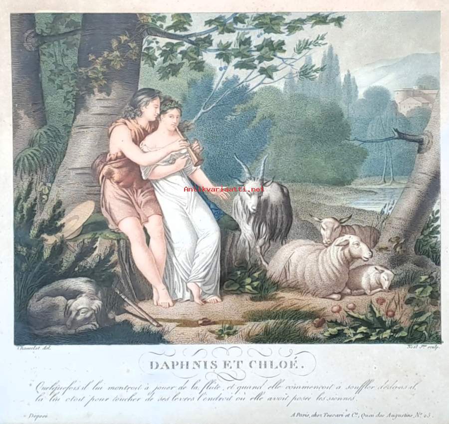 Kuvassa on 1800-luvun kaiverrus, joka esittää klassista kohtausta kreikkalaisesta mytologiasta nimeltään Daphnis ja Chloë. Tämä nimenomainen teos perustuu ranskalaisen taiteilijan Charles Abraham Chasselatin (1782–1843) piirrokseen. Kaiverrus kuvaa nuorta rakastavaista paria idyllisessä ympäristössä lampaiden ja vuohien ympäröimänä. Alaosan teksti ranskaksi kuvailee hetkeä, jolloin Daphnis opettaa Chloëlle huilunsoittoa: "Quelquefois il lui montroit à jouer de la flute..." (Joskus hän näytti hänelle, kuinka huilua soitetaan...). Teoksen keskeisiä tietoja:Aihe: Daphnis ja Chloë, antiikin kreikkalainen rakkaustarina.Alkuperäinen taiteilija: Charles Abraham Chasselat.