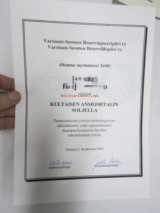 Varsinais-Suomen Reserviupseeripiiri / Reserviläispiiri - Kultainen ansiomitali soljella -myöntökirja (saajan nimi retusoitu kuvasta, on OK itse myöntökirjassa