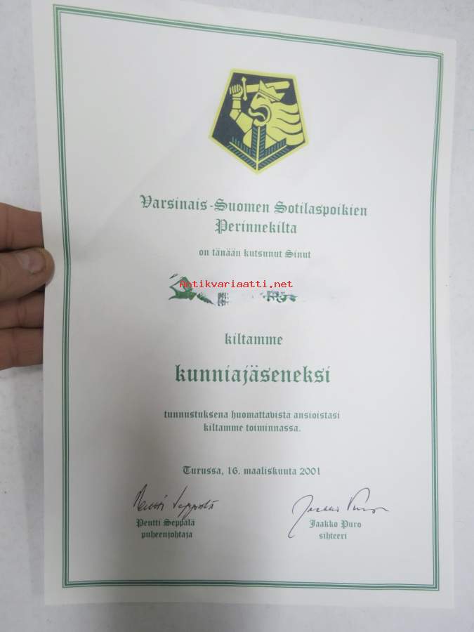 Varsinais-Suomen Sotilaspoikien Perinnekilta - Kunniajäsenyys -myöntökirja (saajan nimi retusoitu kuvasta, on OK itse myöntökirjassa