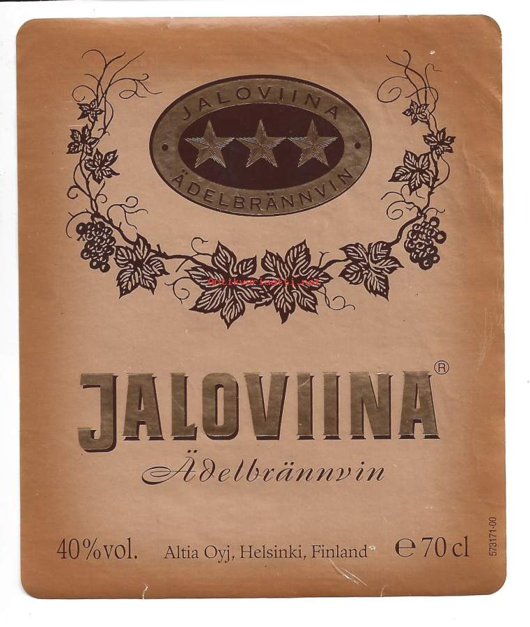 Jaloviina kolmen tähden *** - viinaetiketti / Jaloviina (lempinimenä Jallu, myös leikattu konjakki) on suomalainen rypäletisleestä ja viljaviinasta