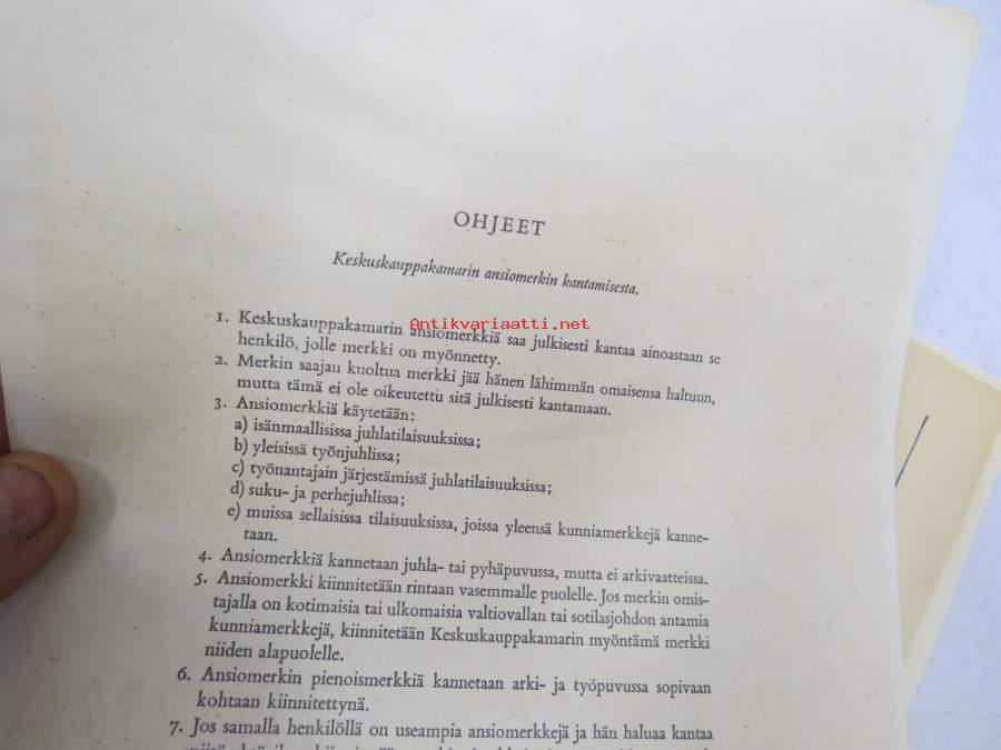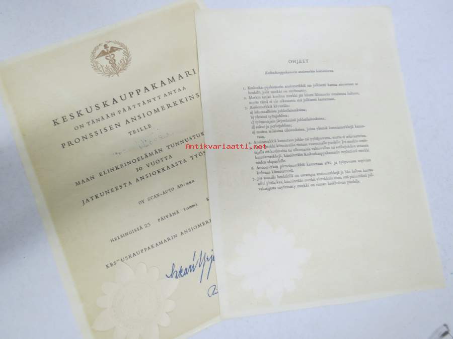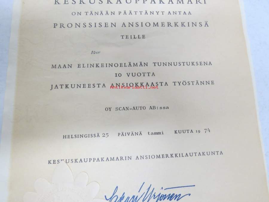 Keskuskauppakamarin hopeinen ansiomerkki myöntökirja