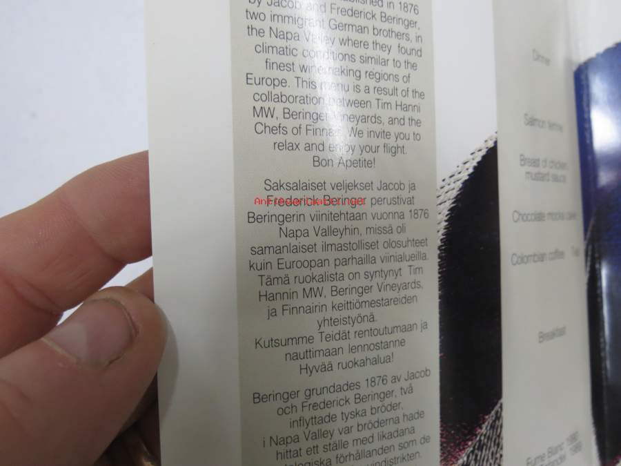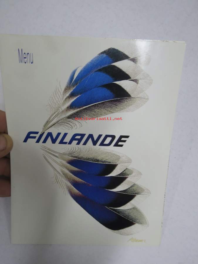 Finnair - Beringer Vineyards "Finlande" -menukortti Finnairin lennoilla USA:an 1990-luvun alkupuolella, kuvittanut Erik Bruun