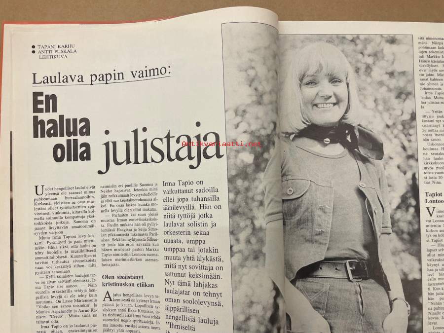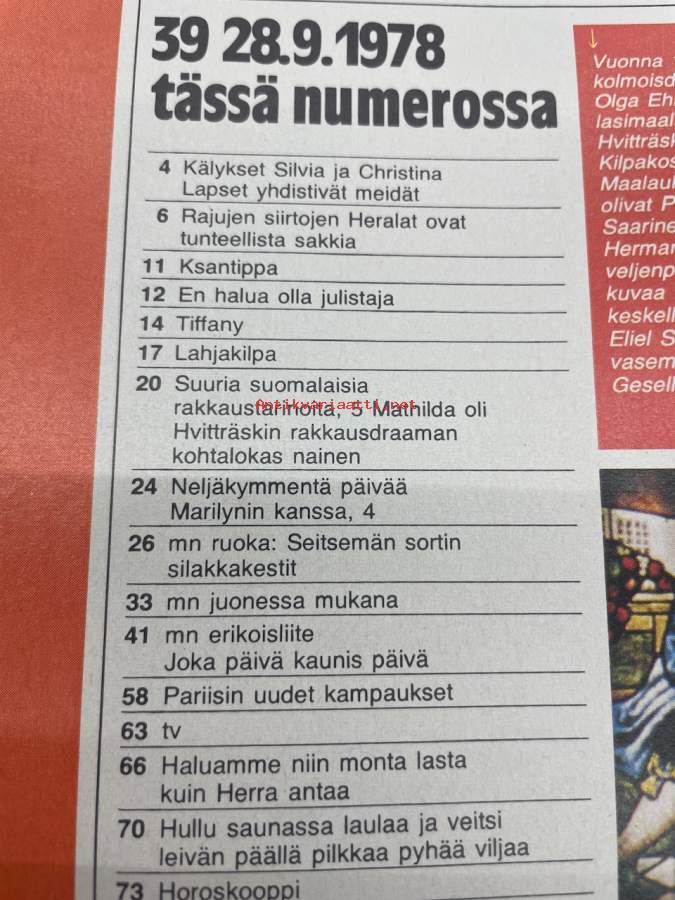 Me Naiset 1978 nr 39 (28.9.), Heralat, Irma Tapio - laulava papin vaimo, Mathilda - Hvitträskin rakkausdraama, neljäkymmentä päivää Marilynin kanssa 4. Jakso