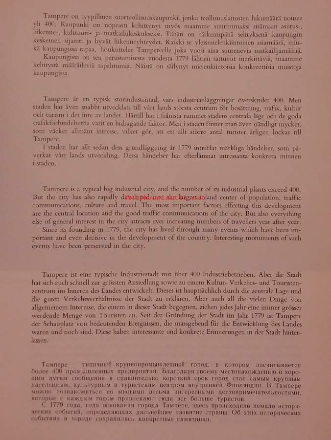 Tampere tänään on 1970–1990‑lukujen taitteen kaupunkikirja, eikä sitä enää paineta. Valokuvateos esittelee Tamperetta, sen arkea, arkkitehtuuria, ihmisiä ja kaupunkikulttuuria. Dimensiot 29 ¤ 22 cm.
