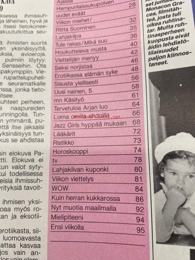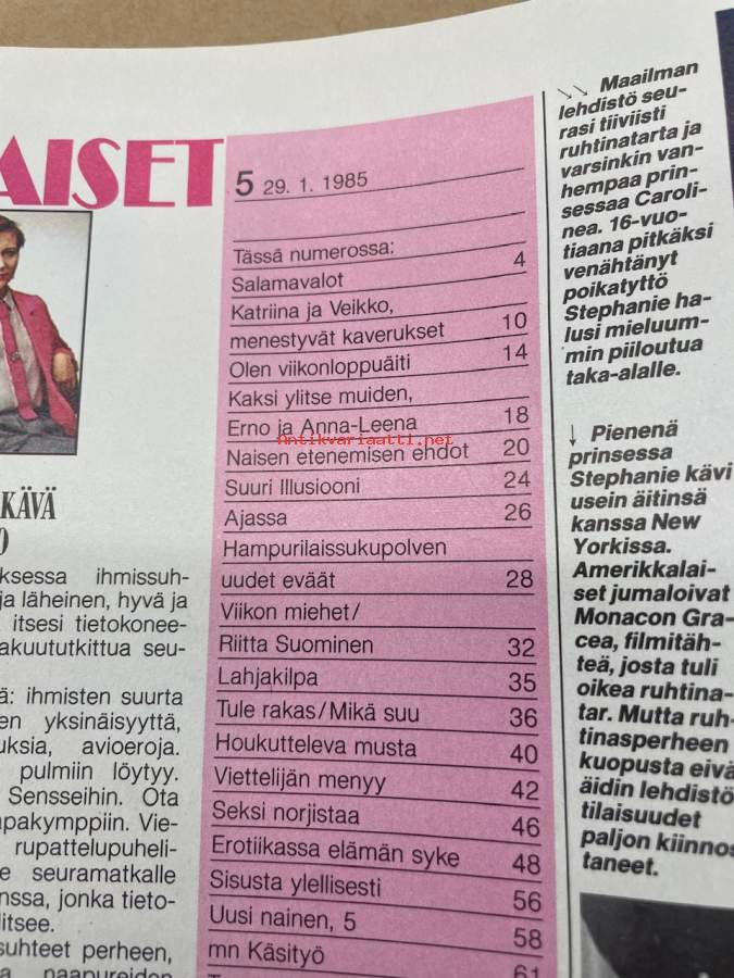 Me Naiset 1985 nr 5 (29.1.), Katriina ja Veikko Vuoristo, Vateva, erotiikka, Olen viikonloppuäiti