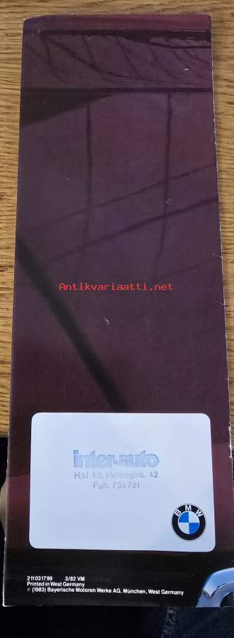 BMW - käyttöohjekirja 316, 318i, 320i, 323i. 1983. Motonet BMW varaosaluettelo vuodelta 1997 ja 1994, lisäksi KL-varaosat BMW varaosa- ja tarvikeuutisia 2002.