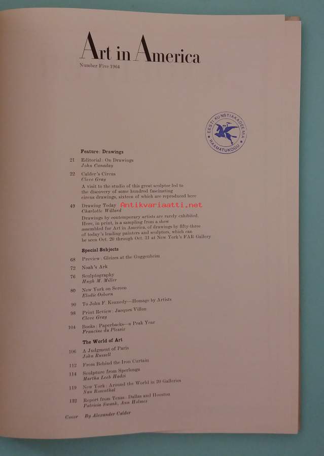 Art in America on yksi Yhdysvaltojen pitkäikäisimmistä ja vaikutusvaltaisimmista taidelehdistä, mikä perustettiin jo vuonna 1913. Lehden tarkoitus oli dokumentoida, arvioida ja edistää amerikkalaista taidetta — sekä kotimaassa että kansainvälisessä kontekstissa. Julkaisun kansikuva: Alexander Calder, yksi 1900‑luvun tunnetuimmista amerikkalaisista taiteilijoistaSisältö: pääteema on piirustukset (mm. Calderin piirrokset 16 kpl)Dimensiot 31 ¤ 23 cm.Kunto: Hieman kulumaa kansissa K3. Yksi leima: Eesti Kunstiakadeemia Raamatukogu, ei muita merkintöjä, ei repeämiä, siistit sisäsivutArt in America is one of the longest‑running and most influential art magazines in the United States, founded already in 1913. The purpose of the magazine was to document, evaluate, and promote American art — both domestically and in an international context.The cover of this issue features artwork by Alexander Calder, one of the most renowned American artists of the 20th century.Content: the main focus is on drawings (including 16 of Calder’s own drawings).Dimensions: 31 × 23 cm.Condition: Some wear on the covers, grade K3.One stamp: Eesti Kunstiakadeemia Raamatukogu; no other markings, no tears, clean interior pages.Sisällöstä/content:On Drawings, Calder’s Cirens, Drawing Today, Preview: Gleizes at the Guggenheim, Noah’s Ark, Sculptography, New York on Screen, To John F. Kennedy—Homage by Artists, Print Review: Jacques Villon, Books: Paperbacks—a Peak Year, A Judgment of Paris, From Behind the Iron Curtain, Sculpture from Sperlonga, New York: Around the World in 20 Galleries, Report from Texas: Dallas and Houston.