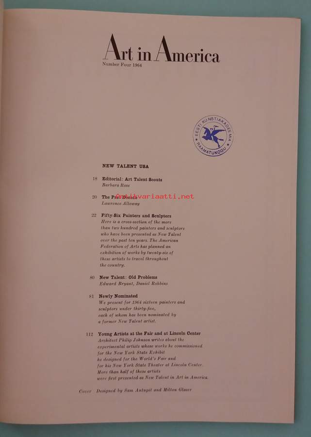 Art in America on yksi Yhdysvaltojen pitkäikäisimmistä ja vaikutusvaltaisimmista taidelehdistä, mikä perustettiin jo vuonna 1913. Lehden tarkoitus oli dokumentoida, arvioida ja edistää amerikkalaista taidetta — sekä kotimaassa että kansainvälisessä kontekstissa. Julkaisun kansikuva: Kannen ovat suunnitelleet Sam Antupit ja Milton Glaser. Glaser oli yksi 1900‑luvun merkittävimmistä amerikkalaisista graafikoista.Sisältö: pääteema on New Talent USA — nuoret ja nousevat amerikkalaiset taiteilijat.Dimensiot 31 ¤ 23 cm.Kunto: Hieman kulumaa kansissa K3. Yksi leima: Eesti Kunstiakadeemia Raamatukogu, ei muita merkintöjä, ei repeämiä, siistit sisäsivutArt in America is one of the longest‑running and most influential art magazines in the United States, founded already in 1913. The purpose of the magazine was to document, evaluate, and promote American art — both domestically and in an international context.The cover of this issue was designed by Sam Antupit and Milton Glaser. Glaser was one of the most important American graphic designers of the 20th century.Content: the main focus is New Talent USA — young and emerging American artists.Dimensions: 31 × 23 cm.Condition: Some wear on the covers, grade K3.One stamp: Eesti Kunstiakadeemia Raamatukogu; no other markings, no tears, clean interior pages.Sisällöstä/content: Art Talent Scouts, The Past Decade, Fifty‑Six Painters and Sculptors, New Talent: Old Problems, Newly Nominated, Young Artists at the Fair and at Lincoln Center.