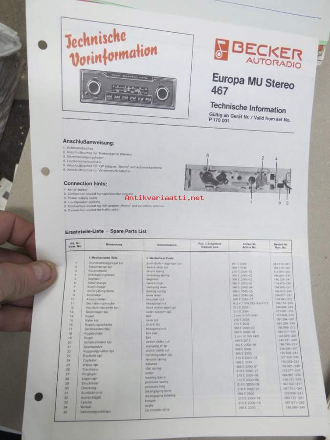 Becker Europa MU 467 - Technische Information / Technical Data -tekniset tiedot, kytkennät, korjaus, varaosat