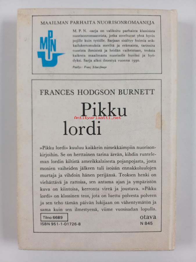 Merkinnät: omistajamerkintäSarja: Maailman parhaita nuorisoromaanejaAlkuteos: Little Lord FauntleroyAsiasanat: englanti, isovanhemmat, ennakkoluulot