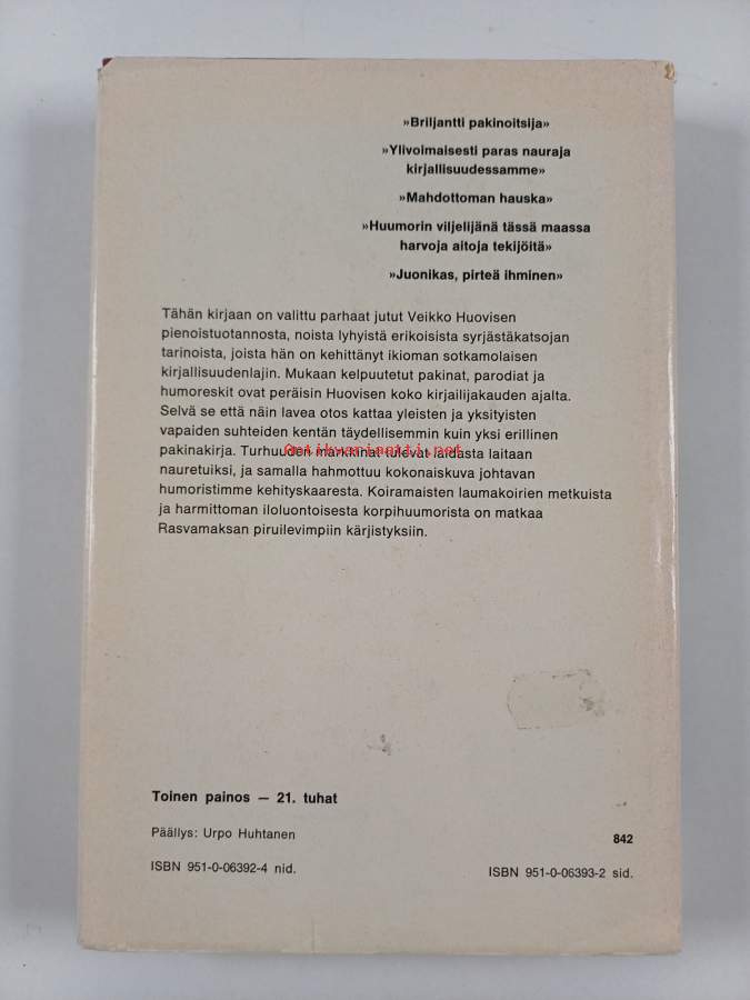Hyvä. Hieman kulumaa, pienoista kolhua kulmissa, selkämyksessä hieman vinoutta. Kansipaperin kunto: repeämiä/kulumaa