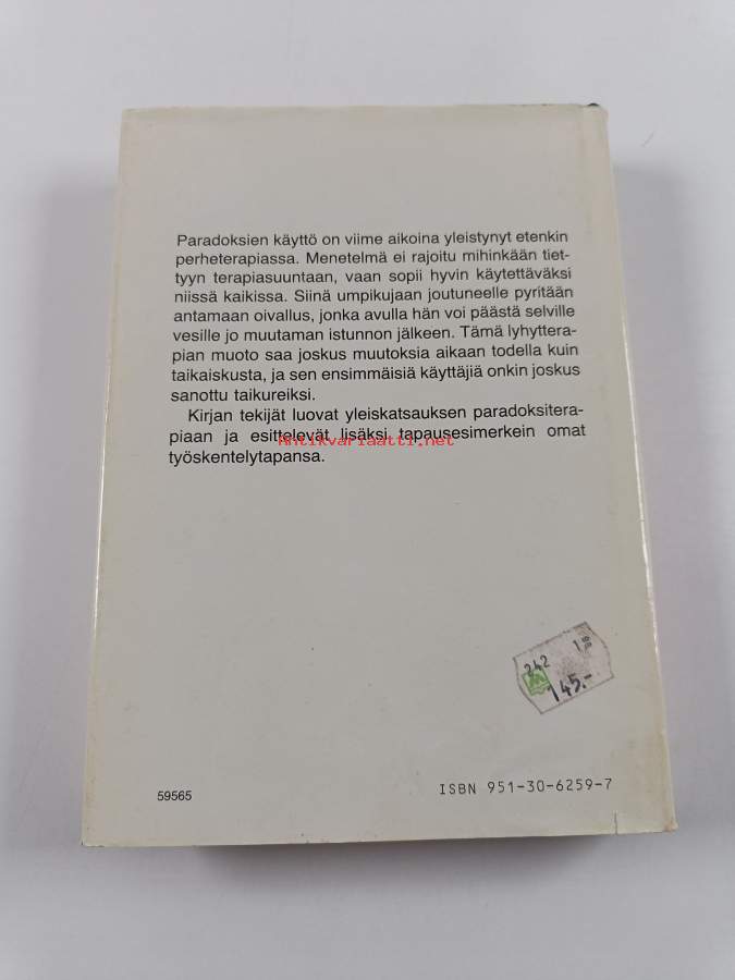 Muu(t) tekijä(t): Mirja RutanenMerkinnät: ylivedetty omistajamerkintäAlkuteos: Paradoxical Psychotherapy: Theory and Practice with Individuals, Couples, and FamiliesAsiasanat: parisuhde, paradoksit, psykoterapia, perheterapia