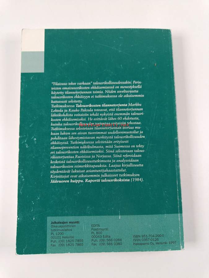 Sarja: Oikeuspoliittisen tutkimuslaitoksen julkaisuja 142; Rikoksentorjunnan neuvottelukunnan julkaisu 6Asiasanat: talousrikokset, ympäristörikokset, petos, verorikokset, työrikokset, konkurssirikokset, rikollisuuden ehkäiseminen