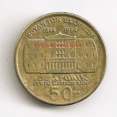 kreikkalainen 50 drakman juhlaraha vuodelta 1994, joka lyötiin Kreikan vuoden 1844 perustuslain 150-vuotisjuhlan kunniaksi. Arvo: 50 drakmaa.Vuosiluku: 1994.Aihe: Kreikan parlamenttitalo (Vouli).Luonne: Keräilykohde/juhlaraha.Kreikankielisen tekstin käännösΒΟΥΛΗ ΤΩΝ ΕΛΛΗΝΩΝ: Kreikan parlamentti1844 1994: 1844 199450 ΧΡΟΝΙΑ ΣΥΝΤΑΓΜΑΤΙΚΟΥ ΒΙΟΥ: 50 vuotta perustuslaillista elämää50 ΔΡΧ: 50 drakmaa