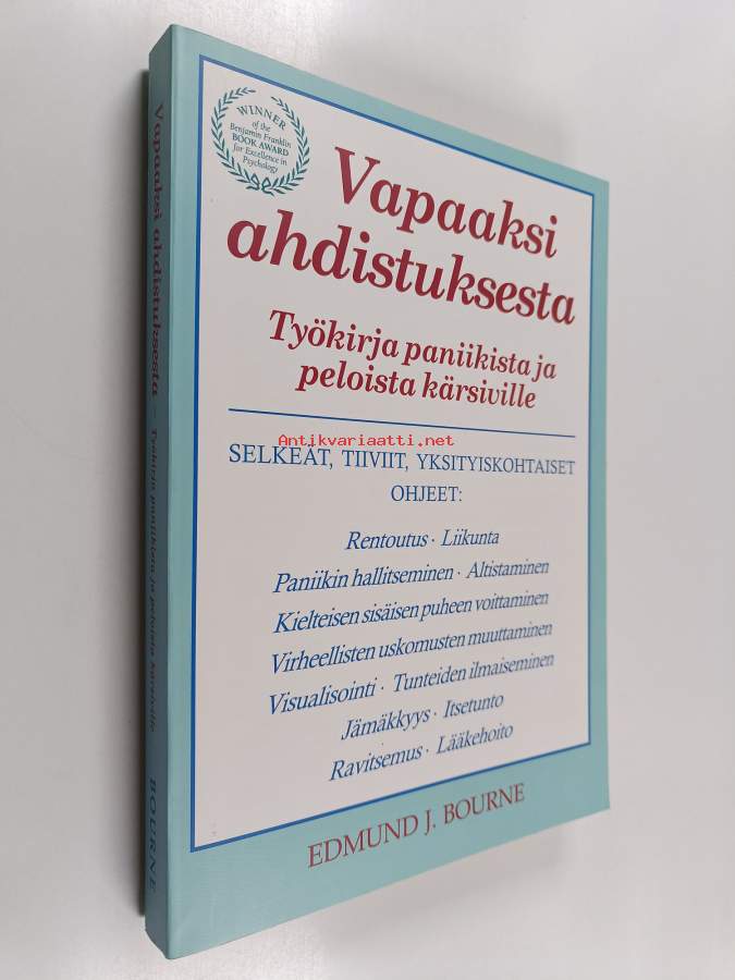 Muu(t) tekijä(t): Riitta BergrothAlkuteos: The anxiety & phobia workbookAsiasanat: mielenterveys, itsetunto, hoitomenetelmät, ravitsemus, rentoutus, itsehoito, itseluottamus, mielikuvat, lääkehoito, mielenterveyshäiriöt, pelot, ahdistus, minäkuva, parantuminen, jännittäminen, parantaminen, fobiat, paniikkihäiriö, mielenterveysongelmat, visualisointi, ahdistuneisuushäiriöt, ahdistuneisuus