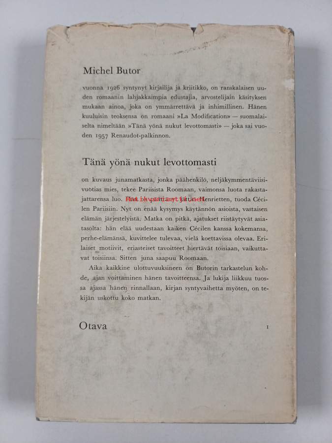 Hyvä. Pienoista kolhua reunoilla ja kulmissa, selkämyksessä vinoutta. Kansipaperin kunto: repeämiä/kulumaa
