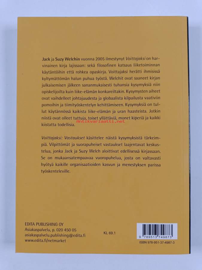 Muu(t) tekijä(t): Maarit Tillman, Suzy WelchAlkuteos: Winning : the answers : confronting 74 of the toughest questions in business todayAsiasanat: menestyminen, yritykset, johtaminen, johtajat, johtajuus, yrittäjyys, yritysstrategiat, urakehitys, henkilöstöjohtaminen, organisaatiot, perheyritykset, muutosjohtaminen, kilpailu (toiminta)