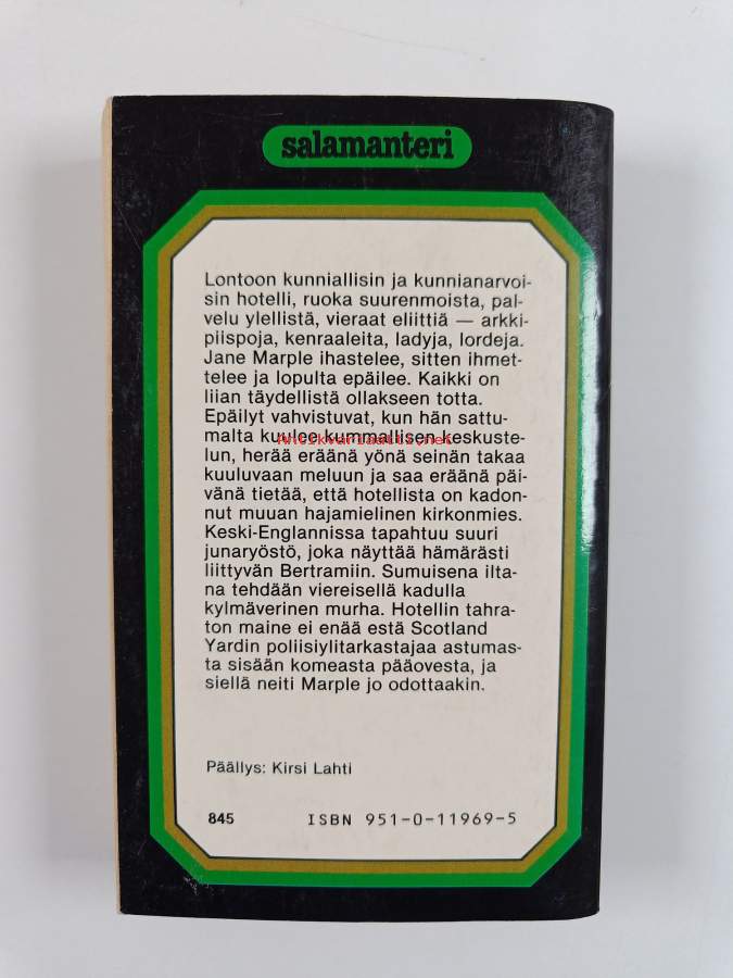 Muu(t) tekijä(t): Simo MäenpääSarja: SalamanteriAlkuteos: At Bertram's hotelAsiasanat: Neiti Marple