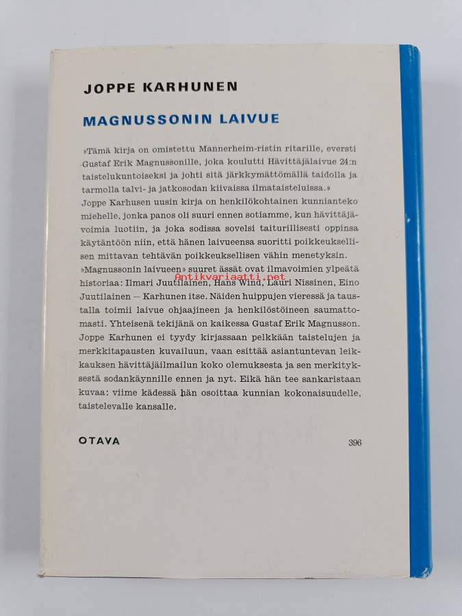 Magnussonin laivue - Suurten ilmavoittojen salaisuus. Kirja on omistettu Mannerheim-ristin ritarille, eversti Gustaf Erik Magnussonille, joka koulutti