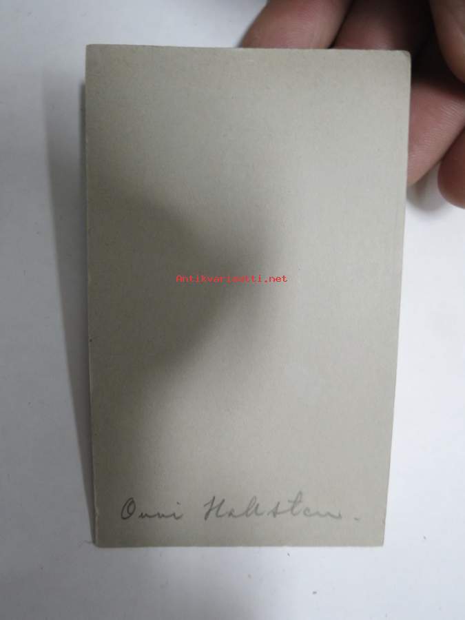 6 x 10 cm. Gustaf Onni Immanuel Hallsten (kirjoitetaan myös Hallstén; 5. tammikuuta 1858 Vaasa – 26. lokakuuta 1937 Helsinki) oli suomalainen oppikoulun lehtori, kanslianeuvos, vakuutusylitarkastaja ja Suomalaisen puolueen kansanedustaja.Hallstenin vanhemmat olivat rehtori Alexander Gustaf Julius Hallsten ja Sofia Wihelmina Westerman. Hän pääsi ylioppilaaksi 1875 ja valmistui filosofian kandidaatiksi 1880 ja voimistelunopettajaksi 1884. Hallsten toimi matematiikan ja fysiikan opettaja Helsingin, Vaasan ja Hämeenlinnan oppikouluissa vuoteen 1884 saakka, ja sen jälkeen hän oli Helsingin suomalaisen jatko-opiston matematiikan ja fysiikan lehtorina 1884–1921 sekä Helsingin suomalaisen tyttökoulun matematiikan ja fysiikan lehtorina 1887–1918. Hallstenin ura vakuutusalalla alkoi valtion vakuutustarkastajana vuosina 1901–1918. Hän toimi sittemmin sosiaalihallituksen sosiaalivakuutuksen ylitarkastajana 1918–1923, sosiaaliministeriön vakuutusosaston päällikkönä (vakuutusylitarkastajana) 1923–1931 sekä sosiaaliministeriön vakuutusosaston vt. ylitarkastajana 1931–1933. Hallsten sai kanslianeuvoksen arvonimen vuonna 1925. Hallsten jäi eläkkeelle 31. elokuuta 1933 oltuaan kaikkiaan 52 vuotta valtion palveluksessa.[1]Hallsten oli säätyvaltiopäivillä pappissäädyn jäsenenä vuosina 1899 ja 1900. Myöhemmin hän oli suomalaisen puolueen kansanedustajana vuosina 1908–1910 ja 1911–1917 edustaen Uudenmaan läänin vaalipiiriä. Hän oli eduskunnan työväenasiainvaliokunnan puheenjohtajana 1909 ja valtiovarainvaliokunnan puheenjohtajana 1914. Hallsten oli jäsenenä Kansallis-Osake-Pankin, Hankkijan ja Keskinäisen henkivakuutusyhtiö Suomen hallintoneuvostoissa sekä Pellervo-Seuran, Kauppakorkeakoulun ja Tapaturmavakuutus Oy Kullervon johtokunnissa.Hallsten oli naimisissa vuodesta 1892 kansanedustaja Ilmi Lovisa Bergrothin kanssa. Heidän lapsiaan olivat IKL:n kansanedustaja Rauno Kallia ja järjestövaikuttaja Armi Hallstén-Kallia.