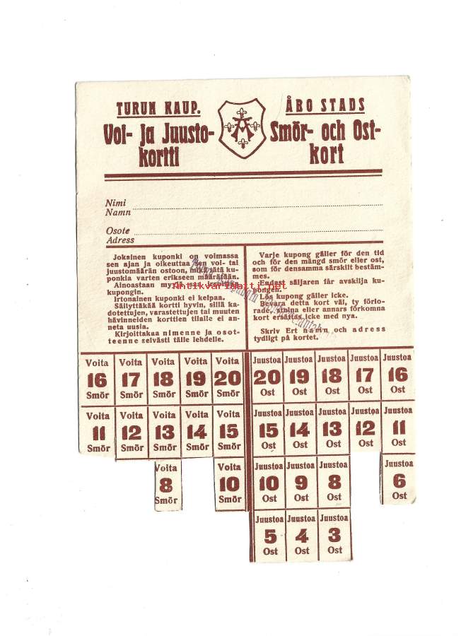 Turun kaup. Voi- ja Juustokortti - ostokortti säännöstelykortti leipäkortti