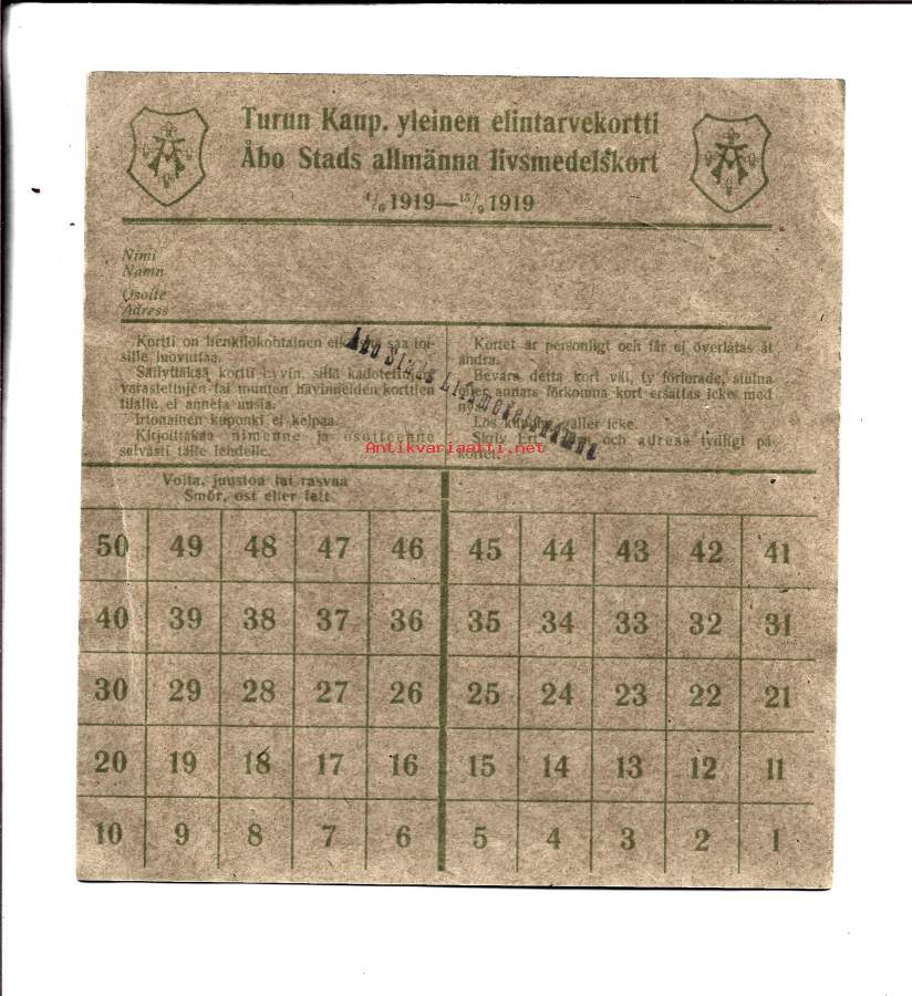Turun kaup. Yleinen elintarvikekortti 1919 - ostokortti säännöstelykortti leipäkortti