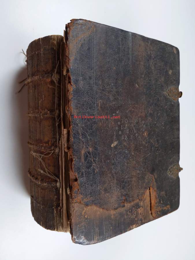 teksti fraktuuraa ; Vanhan Kirkkoraamatun ensimmäinen painos ; joidenkin sivujen reunoilla jonkin verran rispaantumaa/pienoista repeämää ja muutama sivu irti ; joillakin sivulla jonkin verran foxingia (ominaisuus ei puute) ; kahdeksan viimeistä sivua puuttuu ; kannet irti ; selkämys puuttuu ; toinen helojen vyö mukana ; etukanteen stanssattu nimi Tomas Iacobsson (Jakobsson) ja mahdollisesti sana Sapp(a) ; viimeisen sivun numero 344