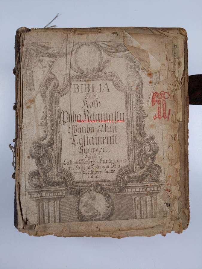 Koko nimi: Biblia, se on: koko Pyhä Raamattu, suomexi alku-raamattuin hebrean ja grekan jälkeen wastauudesta ojettu: esipuhetten, lukuin sisällepitoin, yhtäpitäwäisten Raamatun paikkain osotuxen, ja lisättyin registerein kanssa - Vanha kirkkoraamattuAsiasanat: Lizelius, Antti, Vanha Kirkkoraamattu