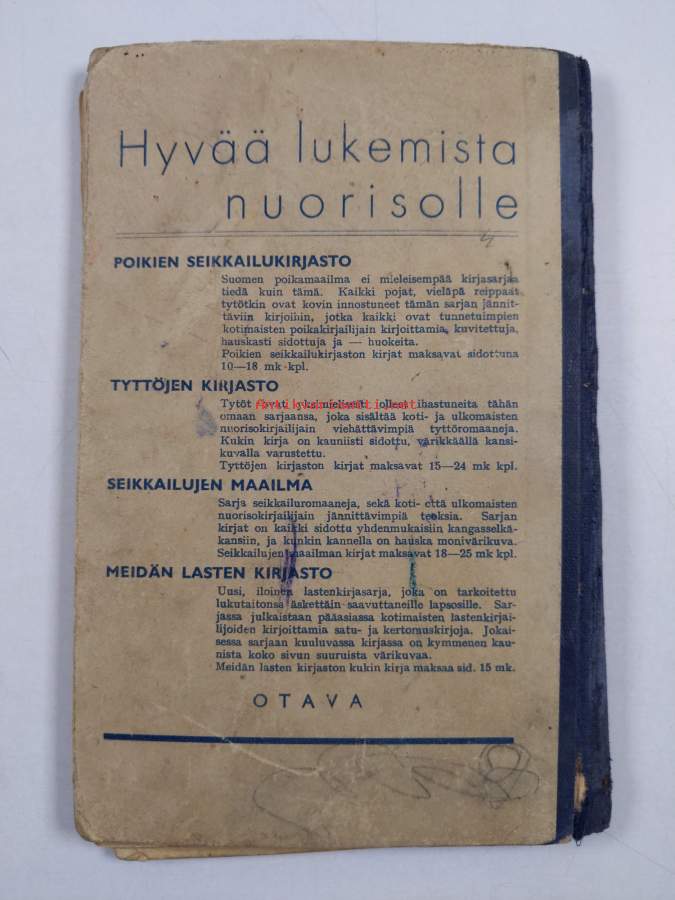 Tyydyttävä. Tarkempi kuntoluokka: K2- ; Selkämyksessä hieman vinoutta. kirjassa hieman taipumaa ; muutamalla ensimmäisellä sivulla hieman läikkää ja aaltoilua ; parilla sivulla hieman repeämää