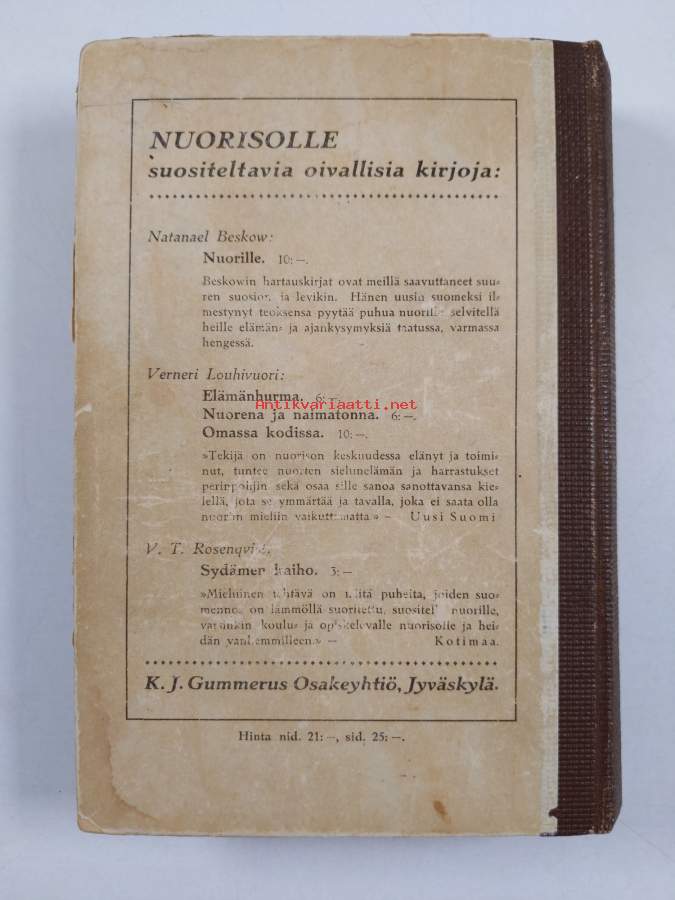 Hyvä. Tarkempi kuntoluokka: K3+ ; Pientä kulumaa kansissa, hieman repeämää reunoilla ja kulmissa, selkämyksessä hieman vinoutta. pienoista tummentumaa sivujen reunoilla