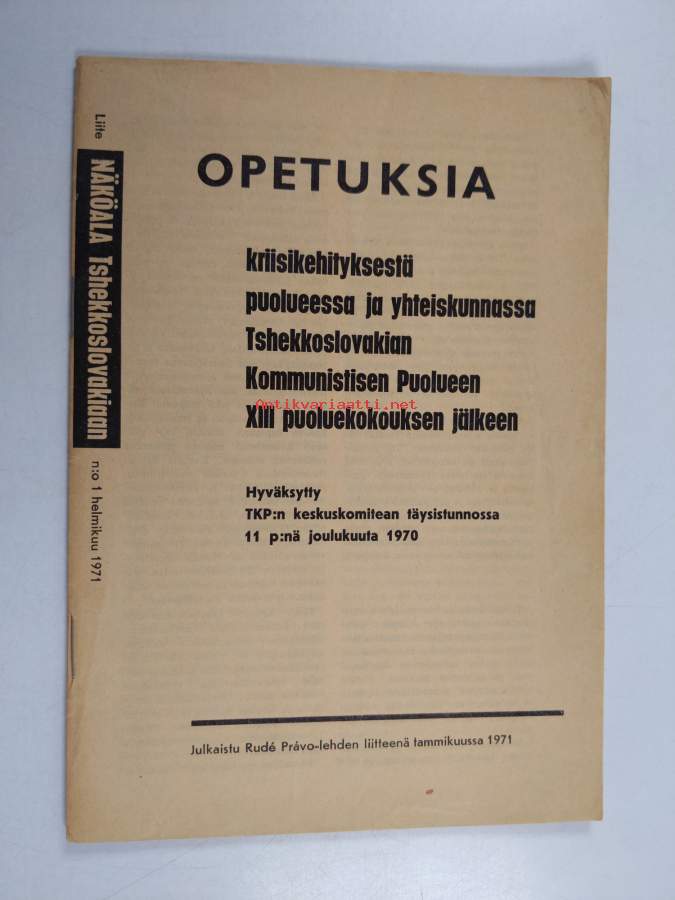 Koko nimi: Opetuksia kriisikehityksestä puolueessa ja yhteiskunnassa Tshekkoslovakian Kommunistisen Puolueen XIII puoluekokouksen jälkeen : hyväksytty TKP:n keskuskomitean täysistunnossa 11 p:nä joulukuuta 1970