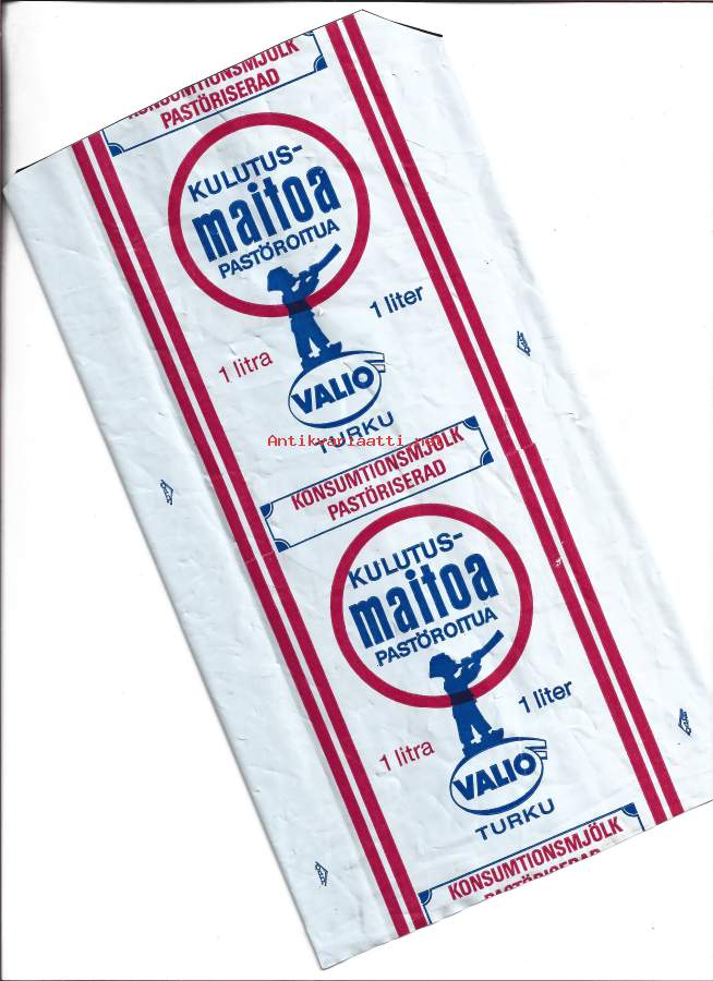 Valio, Turku - kulutusmaitoa - konsumtionsmjölk, maitopussi, muovipussi avattu tuotepakkaus, 1960-70 luvuilla käytössä ollut pakkaus